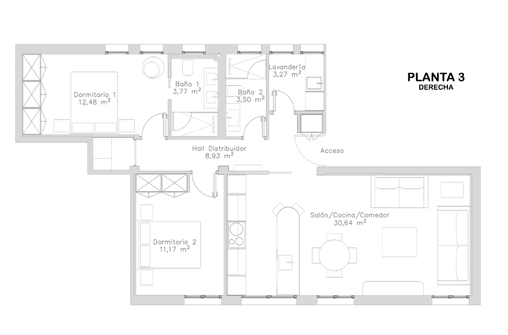 La vivienda cuenta con 111 m² construidos catastrales, distribuidos de forma eficiente para ofrecer espacios cómodos, bien resueltos y adaptados a las necesidades actuales. Dispone de dos amplios dormitorios dobles (uno de ellos exterior), dos baños completos (uno de ellos en suite) y cuarto independiente de lavandería. El salón-comedor, con cocina integrada se plantea como un espacio abierto, elegante y funcional, muy luminoso al disponer de tres grandes ventanales.  El mobiliario y la decoración están incluidos en el precio, permitiendo una entrada inmediata sin necesidad de adaptación. La reforma ha sido ejecutada con especial atención al detalle, priorizando materiales de calidad, soluciones duraderas y una distribución coherente. Los armarios empotrados a medida, el aprovechamiento inteligente de cada metro cuadrado y la armonía visual entre estancias reflejan un proyecto trabajado con criterio y sensibilidad.